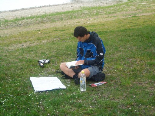 Volker war der erste beim Zeltabbau ... Kartenstudium und kleine Buchlektüre